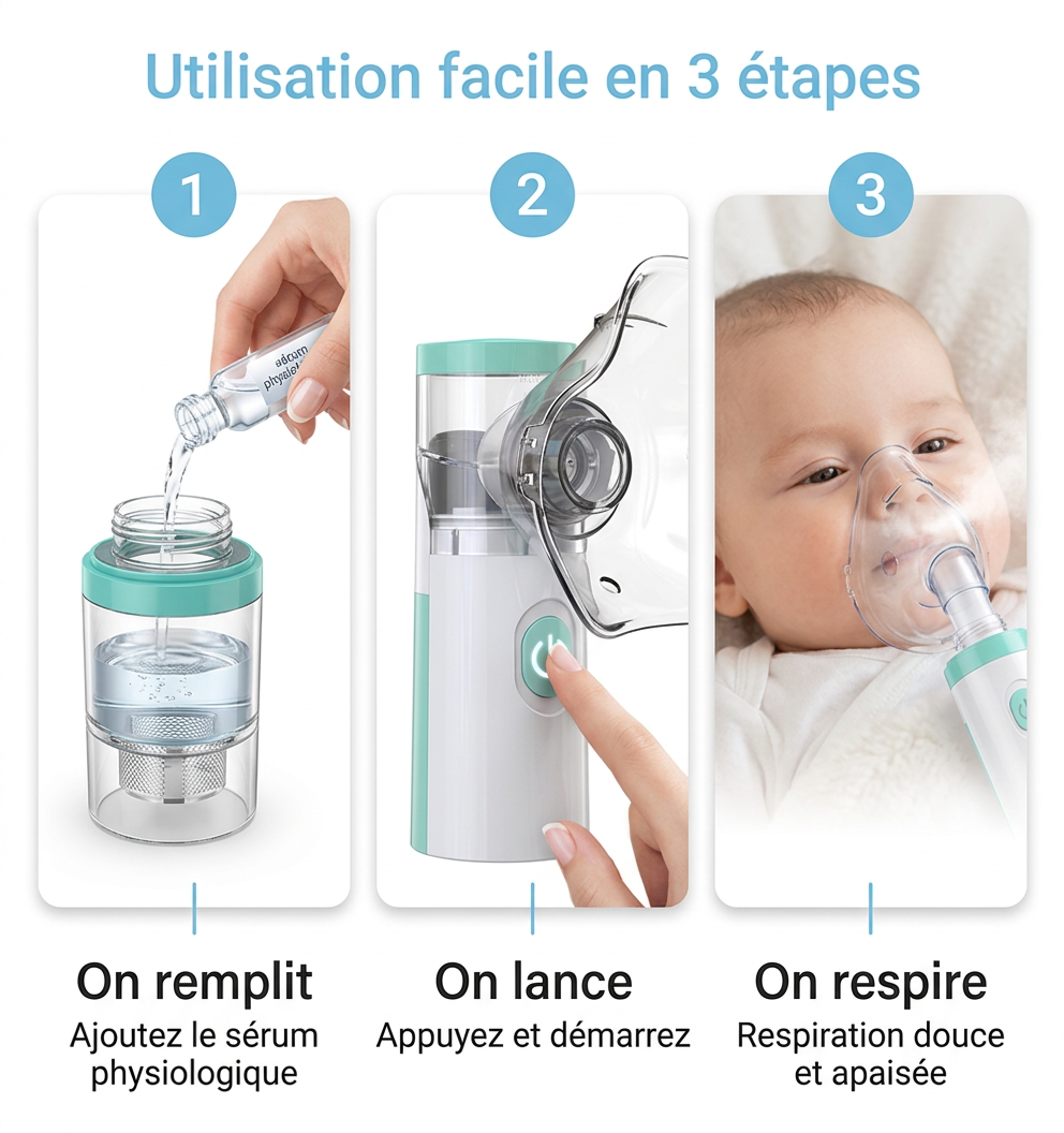 Dès 1 mois, sur avis d’un professionnel de santé et avec le masque bébé. Beaucoup de familles l’emploient ensuite ponctuellement (2–3 min) pour apporter du confort, toujours sous la surveillance d’un adulte.