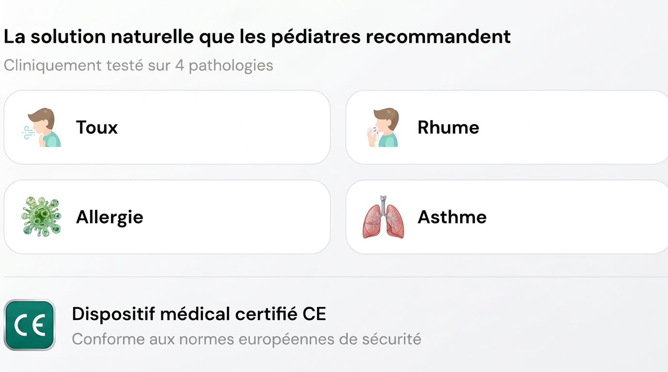 Chaque séance dure entre 5 et 10 minutes seulement. Un temps court mais suffisant pour que le traitement agisse en profondeur et dégage les voies respiratoires de votre enfant.