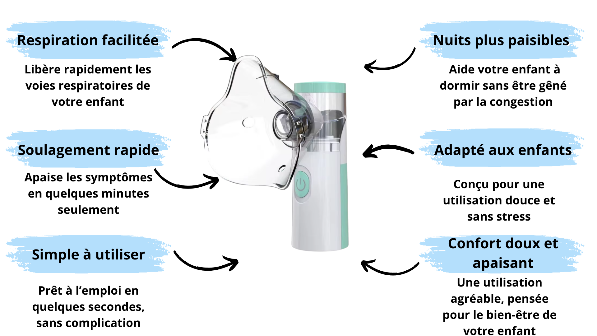 Grâce à sa technologie avancée, il diffuse une brume fine qui atteint facilement les bronches, permettant à votre enfant de recevoir son traitement en toute tranquillité, sans bruit, sans stress.